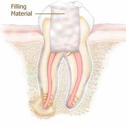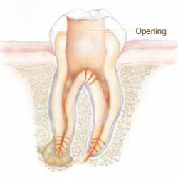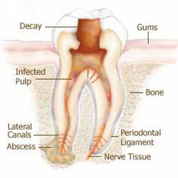 When nerve tissue or pulp is damaged, it breaks down and bacteria begin to multiply within the pulp chamber. The bacteria and other decayed debris can cause an infection or abscessed tooth. An abscess is a pus-filled pocket that forms at the end of the roots of the tooth. An abscess occurs when the infection spreads all the way past the ends of the roots of the tooth. In addition to an abscess, an infection in the root canal of a tooth can cause: