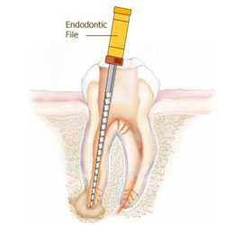 An access hole will then be drilled into the tooth. The pulp along with bacteria, the decayed nerve tissue and related debris is removed from the tooth. The cleaning out process is accomplished using root canal files. A series of these files of increasing diameter are each subsequently placed into the access hole and worked down the full length of the tooth to scrape and scrub the sides of the root canals. Water or sodium hypochlorite is used periodically to flush away the debris.