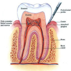 The pulp or pulp chamber is the soft area within the center of the tooth. The tooth’s nerve lies within root canals, which lie within the roots or “legs” of the tooth. The root canals travel from the tip of the tooth’s root into the pulp chamber, which also contains blood vessels and connective tissue that nourish the tooth.